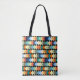This tote bag has a geometric design of light-coloured diamonds overlapping each other on a field of black.