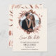 A simple and elegant wedding Save the Date card featuring chic floral wreath and rose gold foil design that is easy to personalise with your details. The card has a modern boho style, customisable calligraphy, handwritten font, and a wreath photo wedding invitation.