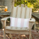 This pink and white striped pillow has a trendy Palm Beach aesthetic when combined with a tropical leaf pattern.