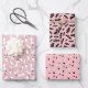 A set of wrapping paper sheets for Halloween featuring three black, pink and white patterns: ghosts; bats; and stars.