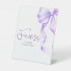Part of the elegant purple bow invitation suite, this modern bridal shower (or baby shower, engagement party, etc.) pedestal sign adds a stylish, coordinated touch to your celebration. Featuring a graceful light purple watercolor ribbon along the edge, it is perfect for guiding guests to the favours table, this sign brings together beauty and function — a small but meaningful detail that ties your decor together seamlessly.