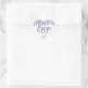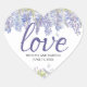 Very pretty heart-shaped love sticker personalised with your names and wedding date. Light purple wisteria drapes beautifully from vines at the top of the heart. There's just a hint of a vine at the bottom. Love is written in a large purple script, between the watercolor wisteria flowers and your personal info.