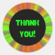 Customisable round "Thank You" stickers with bright lime green text. The accompanying digital art features a fluorescent neon orange, green and yellow abstract fractal design, but you can add your own photo or image. The black circle gives you an area on the design to add custom text. Customise the font style, size and colour as needed for your personalised text message.