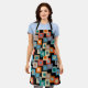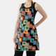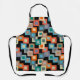 This apron has a geometric design of squares inside squares in lighter shades of blue, teal, orange, tan, off-white, mango, and gray on a field of black.