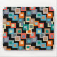 This mouse pad has a geometric design of squares inside squares in lighter shades of blue, teal, orange, tan, off-white, mango, and grey on a field of black.
