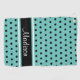 This design has a light teal background with black polka dots and black, light teal and white stripes. The name is in a script font and can be customised using the template field.