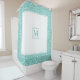 Light teal blue and white damask pattern and white square with monogram shower curtain. It showcases a light teal blue and white damask pattern and a white square in the centre with your monogram and scalloped borders. You can personalise it with your family name and monogram.