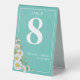 Pretty wedding table numbers design features watercolor white daisies corner on light teal background with white customisable text blocks in modern fonts