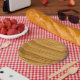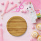 Paper plates with a photograph of a wooden panel showing the wood grain.