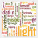 This artwork centres on the word "light" rendered in large, bold letters. Surrounding this focal point are numerous related words, arranged in varying sizes and orientations, filling the frame and creating a dense, visually interesting composition. The arrangement of words forms a lively word cloud, emphasising the central theme of light.