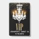 Chic Sweet 16 or Quinceañera party accessory badge done in black with graphics of a white chandelier that looks lit up, and gold looking glitter across the top. Graphics text in golden glitter reads VIP. White text, on the bottom, is ready to personalize for your daughter's big day.
