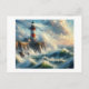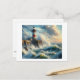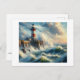 A lighthouse stands resilient on a rocky coast amid crashing waves. The bright sky contrasts with the turbulent sea, creating a dramatic scene.