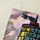 traditional watercolor artwork of a lighthouse standing on a green island with a colourful sunset and distant mountains in the background on a beack towel