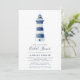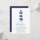 Our coastal chic bridal shower invitations feature a blue and white watercolor lighthouse illustration, with your bridal shower details beneath in navy blue lettering. Invitations reverse to solid nautical navy blue.