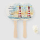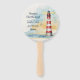 This round hand fan features a serene watercolor illustration of a classic red and white striped lighthouse standing tall against a soft seaside backdrop. The design showcases gentle blue waves, a distant sailboat, and soaring birds, creating a peaceful coastal atmosphere that appeals to any ocean lover. A heartfelt birthday message is printed in a clean navy font, complemented by a glowing yellow beacon that symbolises a bright year ahead. Perfect for outdoor summer parties, beach celebrations, or nautical-themed gatherings, this accessory blends functional cooling with a timeless maritime aesthetic that anyone can appreciate.