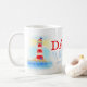 Fun nautical lighthouse art mug. A perfect fun gift for Daddy's who enjoy a sailing or being by the sea. Reads Daddy you light up our life love Chloe and Timmy, customise with your own names and choice of words. Watercolor art and design by Sarah Trett.