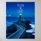 Lighthouse at twilight flashing its beacon into the sea. The words "Follow the Light" are written in white text.