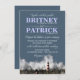 Lighthouse Nautical Themed Wedding Invitations -- feature a medium blue background with waves, rocks, water and a red and white striped lighthouse design. These wedding invitations are set to high quality basic card stock; however, you can upgrade to fancier types to the above right. Each invitation comes with a fitted white envelope. See matching wedding RSVP cards below to complete the suite. *Perfect for weddings at Cape Cod,
