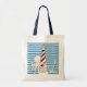 Bright blue and white horizontal stripe tote bag with a nautical ocean theme features a red and white striped lighthouse and an octopus that's wearing a sailor hat!