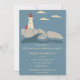 All the text on this invitation is ready to be customized so you can create the perfect invitation for birthday parties and other special events. It has a simple nautical style illustration of a lighthouse in red and cream or ivory. The lighthouse stands on a rocky shore with waves crashing below and cream colored clouds in the sky. The graphic is set against a soft French blue background.
