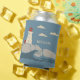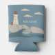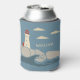 This personalised can sleeve or can wrap is perfect for enjoying a cold one as you enjoy the ocean view from your beach house deck. It has a simple nautical style illustration of a lighthouse in red and cream or ivory. The lighthouse stands on a rocky shore with waves crashing below and cream coloured clouds in the sky. The graphic is set against a soft French blue background.