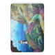 Lighthouse perched on the edge of a cliff over the ocean in shades of blues green gold and purple