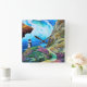 Lighthouse perched on the edge of a cliff over the ocean in shades of blues green gold and purple
