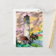 traditional watercolor artwork of a lighthouse standing on a green hill in front of a colourful sunset on a postcard.