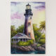 Puzzle with the beautiful painting of a lighthouse sitting on a tropical island with palm trees.