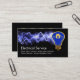 A blue electrical lightning zaps across the darkness and powers up a gold home electrical bulb. You are that power that brings light into homes. Near the base lies the business name and its contact details.