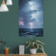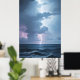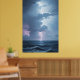 A dramatic digital painting depicts a stormy seascape with a powerful lightning bolt striking the ocean. The sky is dominated by dark, swirling clouds, with a hint of pink in the distance. The lightning bolt is a bright white, illuminating the clouds and the choppy waves below.