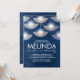 Navy bridal shower invitation with gold upside down umbrellas with lighting inside.