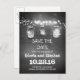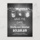 Rustic wooden background save the date postcard with grey hanging lights mason jars.