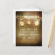 Rustic wooden background save the date postcard with hanging lights mason jars.