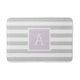 Custom monogrammed bath mat with a preppy stripe pattern in light grey, pastel purple and white colours. Personalise it with your monogram initial in a square frame. Use the design tools to choose any background colours, edit the text fonts and colours and add your own photos to create a one of a kind design to match any bathroom decor.