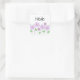 A square sticker with lilac flowers and name. Customise the sticker with your special name or text, background colour, among other options.