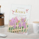 Spark fun at your "She's Fresh Off The Market" bridal shower with this charming "Guess How Many Kisses" pedestal sign! Featuring romantic watercolor lilac and hydrangea flowers in soft lavender, rich purple, and blush pink tones, blooming over a rustic picket fence with fresh green leaves, delicate petals, scattered pink accents, and playful red lipstick kiss marks on a clean white background. Gold script adds elegant flair to the text: "Guess How Many Yummy Kisses Are in the Jar? Closest Guess Wins!"