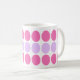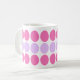 This designer mug features a girly mod pattern of lilack and pink green dots in a contemporary, geometric style.