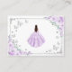 Lilac purple silver and white Quinceanera reception details enclosure cards. Features brunette girl in ball gown dress, script font, silver butterflies, roses and tiara. Perfect for an elegant princess style glam celebration. Personalize with your own details.
