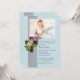 A beautiful, heirloom image of a wooden cross with white and lavender lilacs. The cross rests on a blue and pink check ribbon and a blue background. This sophisticated, religious invitation is perfect for First Holy Communions or Confirmations.