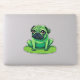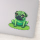 Cute green Pug resembling a frog sitting on a lilipad. Background colour can be changed.