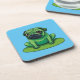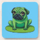 Cute green Pug resembling a frog sitting on a lilipad. Background colour can be changed.