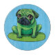 Cute green Pug resembling a frog sitting on a lilipad. Background colour can be changed.