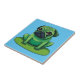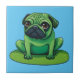 Cute green Pug resembling a frog sitting on a lilipad. Background colour can be changed.