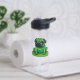 Cute green Pug resembling a frog sitting on a lilipad. Background colour can be changed.