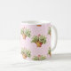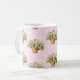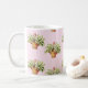 Cottage chic mug features wicker baskets of lily of the valley flowers on a pink and white polka dot background.