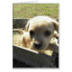small puppy in wooden box filled with straw