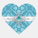 A Thank You heart shaped wedding sticker in a turquoise floral damask pattern of lilies from the Art Nouveau period. A silver ribbon and a faux topaz gemstone in a silver setting to add a little bling, adding a touch of opulence and sophistication.