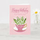 A quaint little pink tea cup filled with a beautiful bunch of lily of the valley flowers along with the hand lettered words Happy Birthday on the top of card and the hand lettered words 51 today with love hearts on the tea cup. A sweet birthday card for your aunt turning 51 today!
