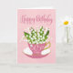 A quaint little pink teacup filled with a beautiful bunch of lily of the valley flowers along with the hand lettered words Happy Birthday on the top of card and the hand lettered words 65 today with love hearts on the tea cup. A sweet birthday card for someone special turning 65 today!